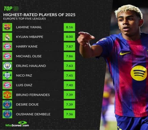 whoscored统计了2025年五大联赛场均评分榜,亚马尔力压姆巴佩居首。whoscored2025五大联赛评分榜: