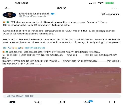 迪奥曼德刚从非洲杯回来,对阵拜仁慕尼黑就有了精彩表现。为RB莱比锡创造了最多的机会(3次),更被欣赏的是他的工作态度,他完成了8次抢断:在莱比锡球员中排名第二。